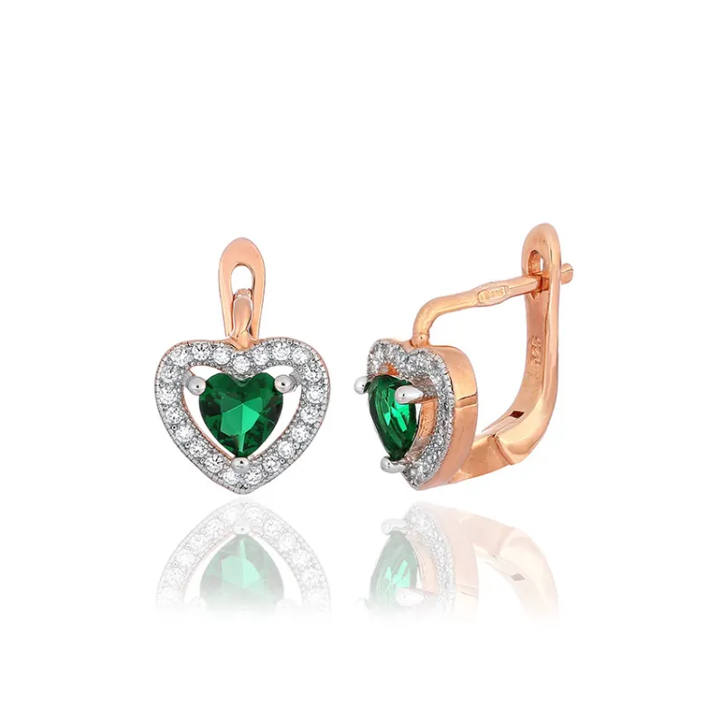Назва виробу: Срібні сережки в позолоті зі смарагдовими фіанітами серця